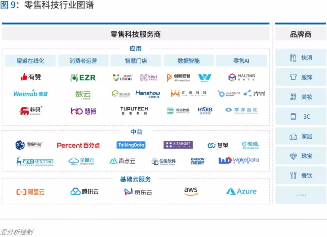 众多传统零售信息化厂商和新兴的技术厂商,共同推动着技术在零售行业的应用落地。以下是面向品牌商的零售科技行业图谱,并列出了部分代表性的零售科技服务商。