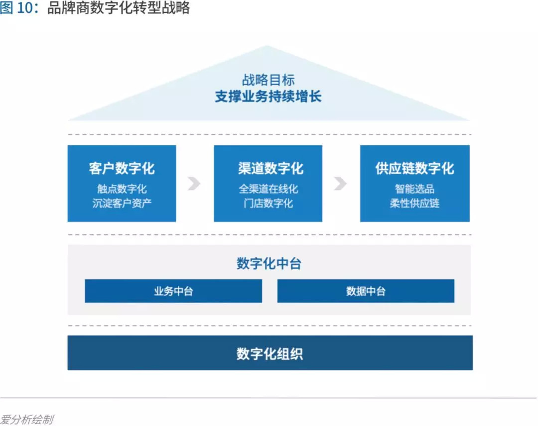 为了支撑数字化转型战略,品牌商在组织方面需要进行数字化变革,在IT基础设施方面需要搭建数字化中台,包括业务中台和数据中台。