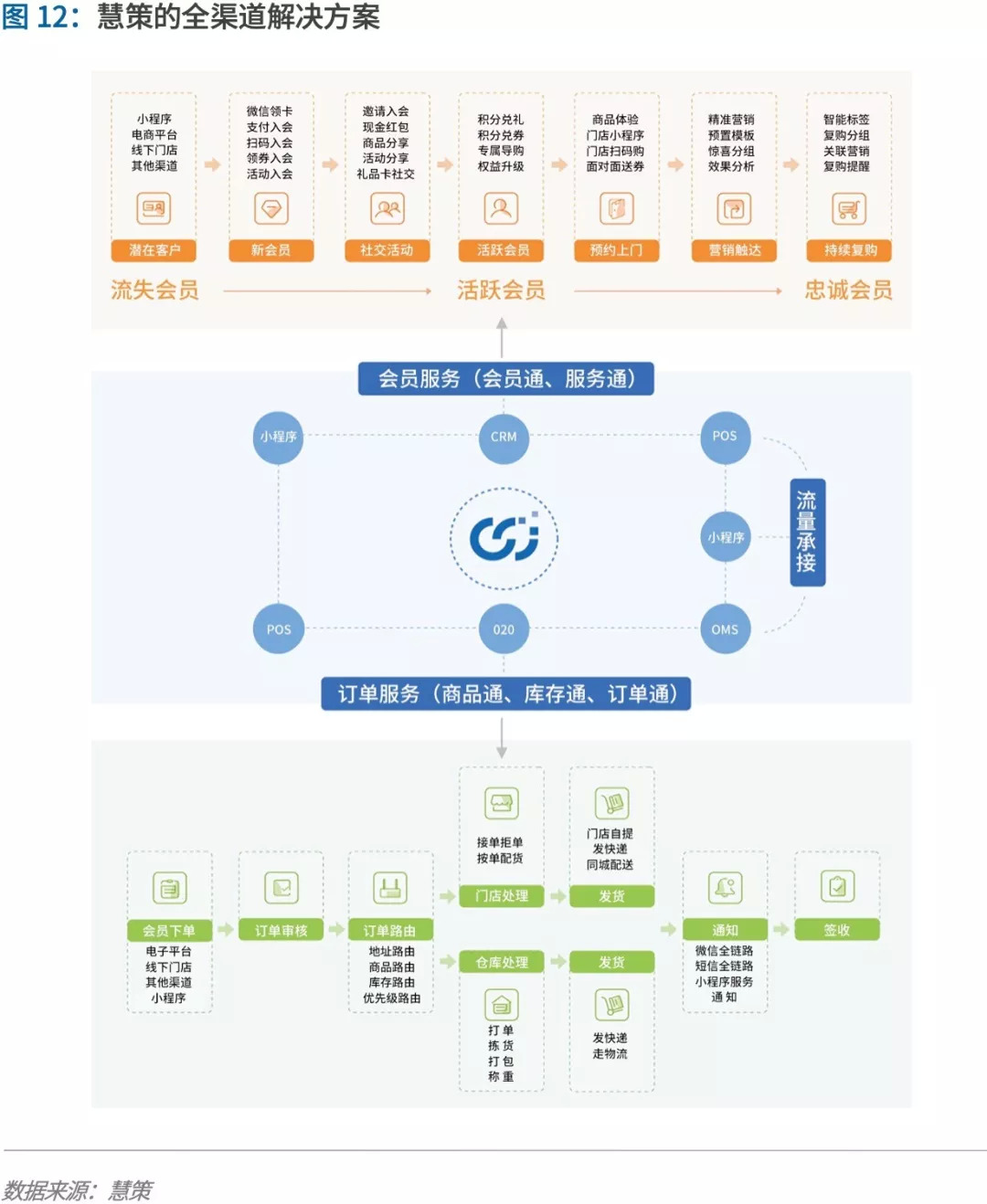 发展至今,慧策形成了基于零售企业经营全链路布局的产品体系,从前端流量吸引到订单仓储管理再到消费数据管理,包含店+小程序、闪店通分销系统、智能POS、旺店通ERP、旺店通WMS、卡米全渠道、客优CRM、云筹大数据等产品线。各产品模块可根据客户需求灵活构建解决方案,包括线上电商解决方案、全渠道解决方案、新零售解决方案等。