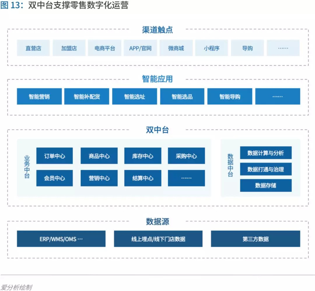 数字化中台:业务的数字化需要IT基础设施的支撑。品牌商传统的IT基础设施以业务信息化为主要目的,构建了ERP、WMS、OMS等一系列业务系统。然而,随着前端业务数字化带来的在线实时连接、全渠道融合、数据智能等需求,传统的IT基础设施难以支撑这些需求。以业务中台和数据中台为代表的数字化中台正在零售行业加速落地,有望成为支撑品牌商数字化转型的新一代IT基础设施。