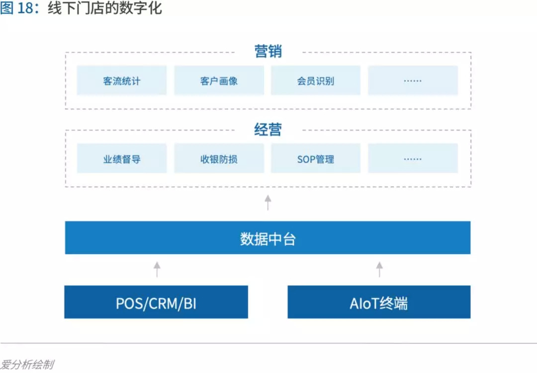在品牌商的渠道体系中,线下门店是数字化的主要洼地。线下门店的数字化,主要通过业务系统上云和部署基于AIoT的智能系统来实现数据采集,再应用于门店经营智能化和营销智能化方面。