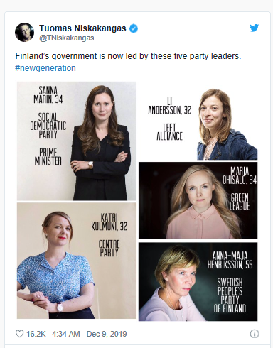 经议会批准的新政府内阁19名部长中有12名为女性。联合执政的五大党派均由女性担任党首,其中四人的年龄更是在35岁以下。除马林以外,另外四人分别是:经济事务部长Katri Kulmuni(32岁),内政部长Maria Ohisalo(34岁),教育部长Li Andersson(32岁)和司法部长Anna-Maja Henriksson(55岁)。