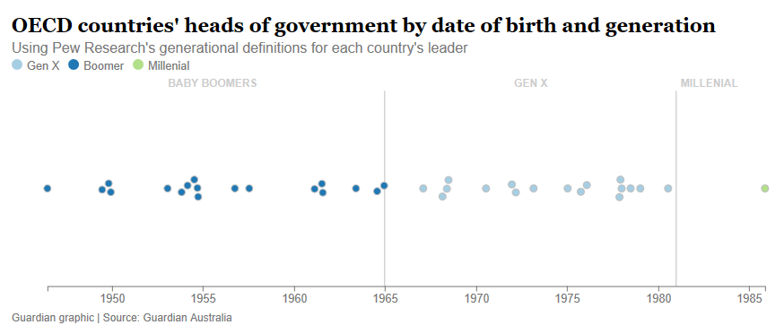 马林创下的纪录可能不止世界最年轻总理这么简单。从经合组织(OECD)各个国家领导人的出生年代可以看出,马林是目前OECD国家中唯一一个真正的千禧一代领导人。“85后”在世界政治舞台上的出现意味着更多新颖议题的设定和打破传统的政策走向。