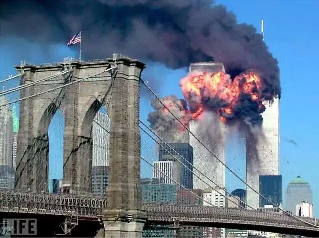 2001年9月11日被劫持的美航175号航班,就是大家所说的“第二架飞机”,撞上世贸中心的南塔后爆炸起火。照片里有黑烟,惊悚的耀眼火焰,蓝天,美丽的布鲁克林大桥上飘着美国国旗——足以告诉你那天发生了什么,如果有人要构画一幅“9/11”袭击图,这张惊心动魄的照片很可能就是你想画的。