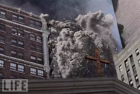 著名新闻摄影师James Nachtwey拍摄的这张南塔崩坍的照片是如此的震撼人心,读者仿佛能身临其境,很难想象照相机后面还有一个人在拍照片,身处险境,却成功逃生。不过除了纯粹的感官体验,照片的另一元素亦让我们惊叹:即镜头本身的构成。建筑和窗户中数不清的硬角度和直线条,教堂的屋顶轮廓线和饱经风霜的十字架——所有这些有棱角的视觉标志都只加深了塔楼崩坍爆炸的恐怖和混乱效果。这儿的十字架:至少在象征意义上,那一天美国到底什么被袭击了?只有无畏的摄影师才会站在Nachtwey站过的地方拍照;只有伟大的摄影师才能给我们贡献一张这么完美的照片。