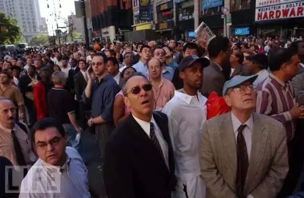 盖蒂图片社的摄影师Spencer Platt拍摄的一幅曼哈顿下城的人群看着双子楼燃烧的照片,很快抓住了那种当时在纽约乃至在全世界飘荡着的怀疑——可当这次袭击的真相逐渐明了,这种强烈的怀疑最后不得不变成一种恐惧伤悲愤怒的混合体。某种意义上,照片中的人群才是恐怖分子真正的目标:来自不同种族的男男女女,老老少少,毫无疑问还有无数个秘密幸存下来只能充当目击者的信条。