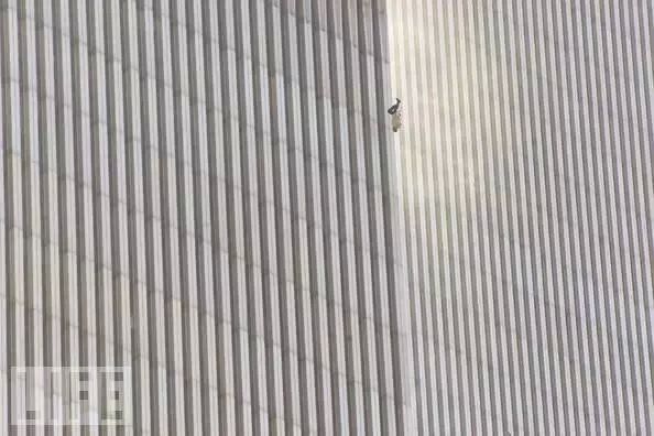 大火正在吞噬塔楼的顶部,一个男子从世贸中心大楼上坠下(也许他是跳下的,因为太多的遇难者跳楼了),类似场面惊悚不断。9月11日的早晨,还在干其他活的摄影师Richard Drew接到电话要他放下手中一切事情,赶往世贸中心。一到那儿他就开始工作,那天晚些时候他开始整理自己拍的照片,然后被这张照片震撼到了——完全有理由。这是关于9/11的一系列照片中最广为人知的一张,从纯粹的专业角度来看,这张照片是激动人心的:把一个迷你人的模型放到巨大抽象的塔楼背景中,那个人是那样的无助和绝望,我们都忍不住伸出双手试图安抚这个小小的无名氏。尽管Drew本人不想猜测那个男子的身份(他告诉《生活》说“我宁愿把他想成是某种不为人知的战士”。)我们不可能不去想假如我们就是那个坠楼的男子——“移情”(译者注:心理学专有名词)会让我们感受到他所有的恐惧。