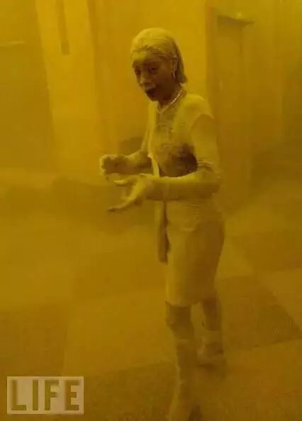 当世贸中心的一座塔楼崩坍时,28岁的March Borders躲进一座办公楼,全身都是灰尘的她吓呆了。烟云和灰尘覆盖了她所在区域,Borders 跑到办公楼寻找庇护,正好自由摄影师Stan Honda也逃进这栋楼,抓拍到她在外面的情形。Honda告诉《生活》说“她当时裹着一层灰白的灰尘,如幽灵一般,我简直不敢相信自己的眼睛,这一定是张好照片,能告诉我们这儿的情形”。在所有关于9.11的照片里,也许Honda的照片最直接反映了当时在曼哈顿下城灾难现场的一个人或一群人内心的惶恐。