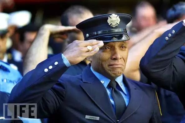 9月11日那天,纽约市警察局损失了23名警官,港务局损失了37人,消防局失去了343个消防员。9月15日,纽约圣方济各教堂为殉职的消防局附属教堂牧师Mychal举行葬礼,参加葬礼的消防员Tony James哭了。9.11之后一连几周为类似葬礼拍照片的摄影师Joe Raedle也参加了葬礼,他告诉《生活》:“任何时候看到一个消防员或者一种象征力量的东西那样伤心流泪,你都会产生共鸣的。”事实上,Raedle的照片中James敬礼的动作如魅影一般在他满是泪痕的脸旁重复着,告诉上百万世人在袭击之后的几天乃至几个星期会这样想:力量才是我们最需要的,也是最难拥有的。