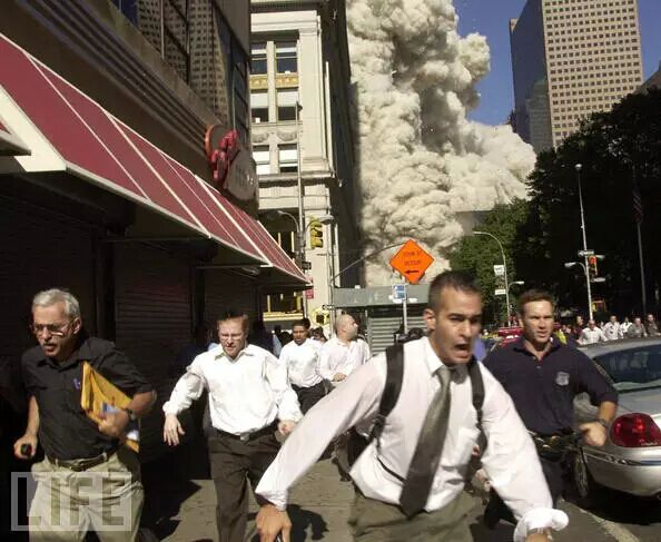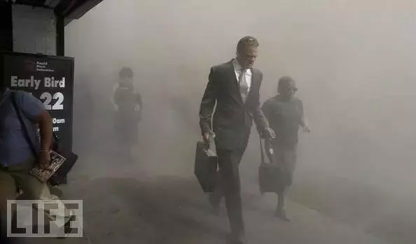 Suzanne Plunkett正在做美联社的一期时装周封面,这时寻呼机显示——“9.11”——意味着她要立马给摄影前台打电话。打不通电话的她猜想这次紧急任务一定和电视里报道的小飞机撞上世贸大厦有关。她坐地铁到了曼哈顿下城——出站后一片混乱。她告诉《生活》,“当时我不知道发生了什么,人们开始从我身边跑过,我呆住了,不过转身跑之前开始拍照片。我边跑边想,究竟怎样才能跑得过朝我这个方向倒塌的100层高楼。”照片里形象逼真的烟云咆哮着穿过曼哈顿下城,给人一种科幻小说里头的恐怖感觉比好莱坞任何一个顶尖特效制作组所能想象的都要可怕。