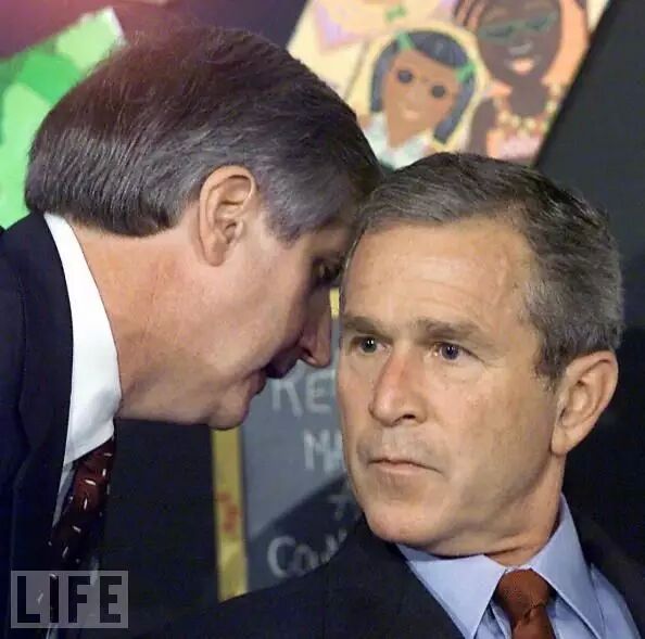 布什总统正在福罗里达州萨拉索塔市参加一个学校班级组织的读书活动,这时总参谋长Andrew Card 告诉他世贸中心被袭击了。十年后,那个班里的一个叫Chantal Guerrero女孩告诉《时代周刊》,她很感谢总统——显然Card告诉总统的事情让他十分不安——不过保持镇静的他陪我们读完了《宠物山羊》。Guerrero说:“我觉得总统是不想让我们察觉,以免我们抓狂。”不管当时总统是不是试图在孩子面前保持冷静,在Paul Richard这幅难忘的照片中,总统的眼神说明了一切:就是从那刻起,9.11后的美国开始了一系列行动:伊拉克和阿富汗战争;抓捕萨达姆和本拉登;影响深远却有争议的爱国法的未知分支;甚至可以包括现在的中东革命——令人心悸的耳语传到了没有准备的总统那儿,过去十年的很多标志事件由此开始的。