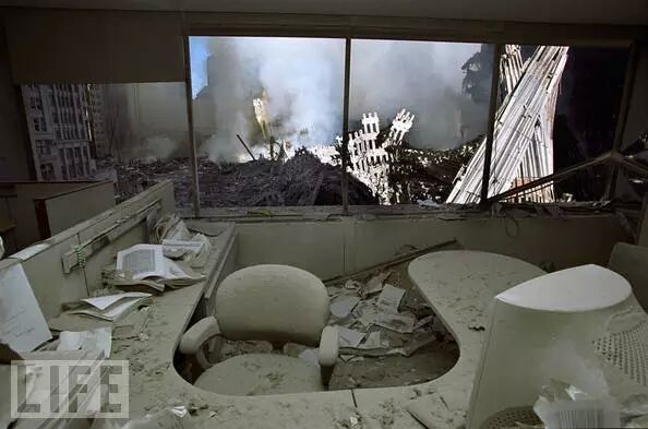 摄影师Jonathan Torgovnik在世贸中心旁一个破损的5楼办公室拍下了这张照片。“我随手打开一间办公室,走进去拍了照片。”摄影师告诉《生活》,“我记得当时感觉真可怕,一想到灾难发生时这个房间还有人——我能感受到他们的存在。”小隔间,散落的文件,办公椅,显示器——这些熟悉的东西给人一种几近安慰的感觉。损毁的窗户外面,那一刻却是一幅世界末日的景象。
