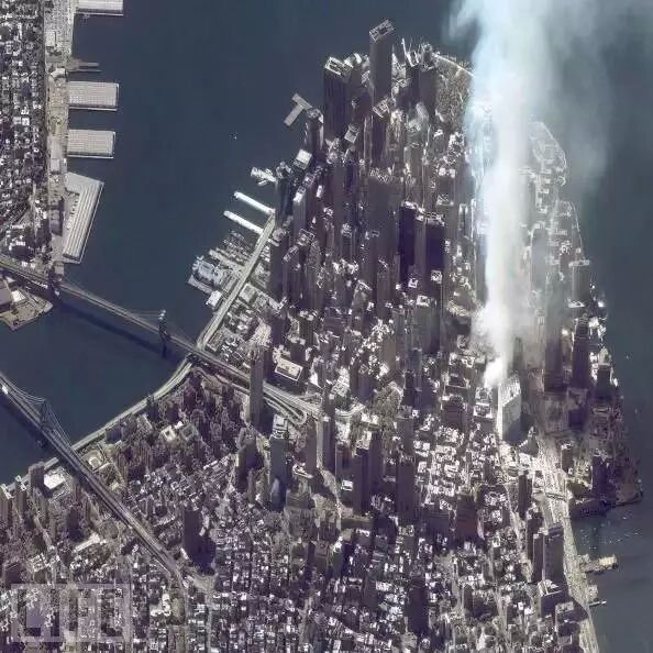 2001年9月12日上午11:43,曼哈顿下城的卫星图显示世贸中心升起的灰尘和烟雾。世贸中心的大火持续烧了99天——像是一个伤感的提示符,时刻提醒着我们数千人失去了生命,还有无数人的生活从此被永远改变。