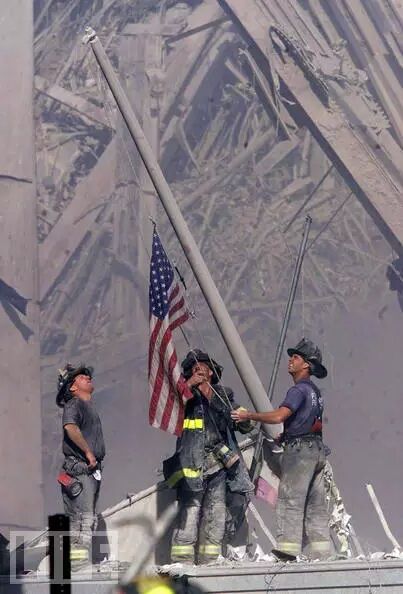 《贝尔根记录》的摄影师Thomas E.Franklin在袭击那天拍下了这张照片。神秘地让人想到了美国历史上最有代表性的照片之一:五名海军和一名海军医护官在硫磺岛上升起星条旗,Joe Rosenthal拍摄于1945年。