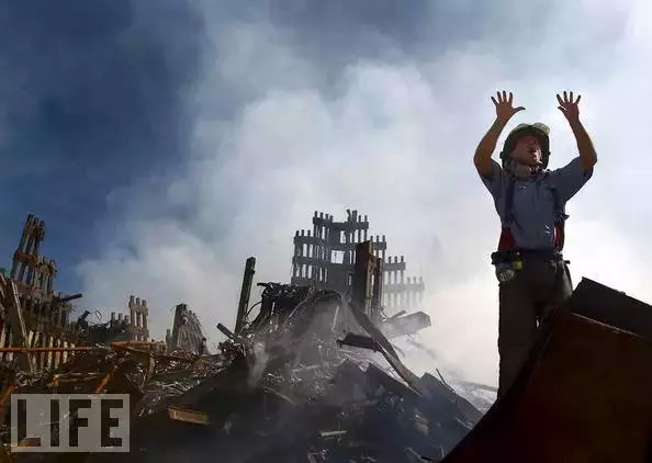 一个纽约消防员呼叫再来十个救援人员进入瓦砾堆搜救。海军摄影师Preston Keres拍下了这张有感触的照片。9.11之后的几个月乃至几年里,“英雄”这个词被用烂了,以至于某种程度上都没有任何意义了。就算这样,是个人都不会说那些第一时间爬到世贸中心的瓦砾堆里救人的警察,急救医生,消防员,无名的志愿者们不是英雄。下面的情形9.11之前就发生了几千次,以后也会继续:数以万计吓坏了的纽约人和游客逃到了安全的地方,逃进避难所,第一批救援者却冲进了无法想象的屠戮场和毁灭场。这张“再来十个人”的照片提醒我们他们的勇敢和牺牲。