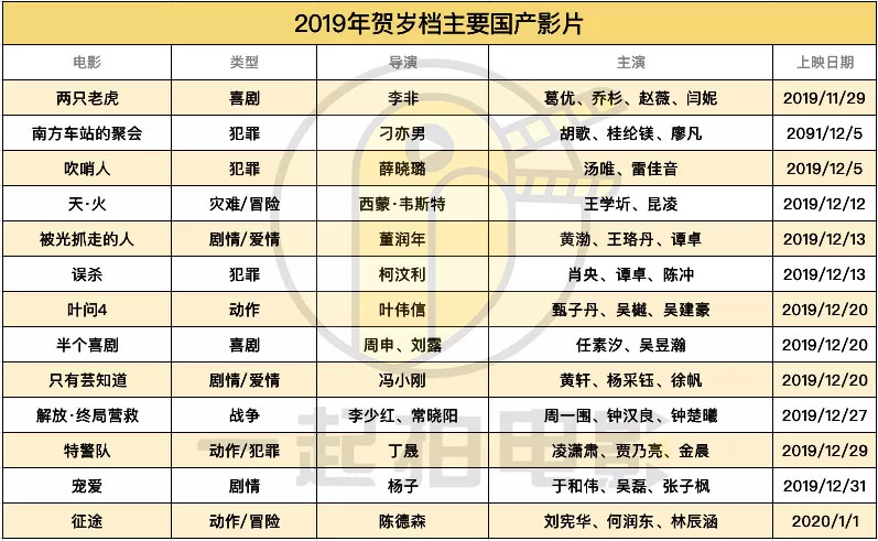 在2009年占据数量最多的古装大片,在2019年已被边缘化,只有《征途》一部算的上是古装片。整体而言,现在贺岁档影片类型更丰富:喜剧、犯罪、动作、灾难、爱情等,并无拘泥于某种类型,从而呈现出了更具新鲜活力的面貌。