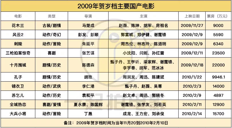也就是说,在2009年,比起以往那些年,有了更明确的档期意识,暑期档、国庆档、贺岁档三大档期逐渐开启之后的竞争之路。除此之外,如今成为各大国产影片最大竞争场所的春节档,也正是在那一年开始显露端倪。