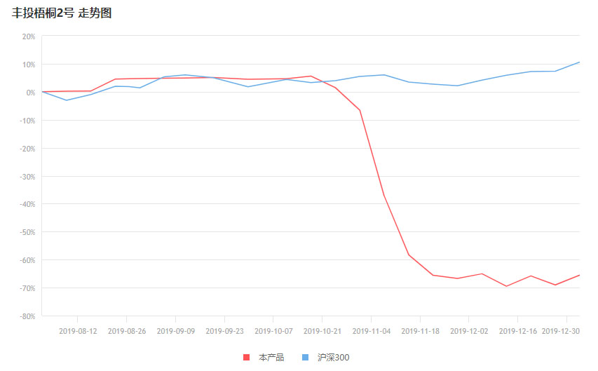 “丰投梧桐2号”成立于2018年12月28日,采用主观多策略,产品自成立以后就一直跑输同期沪深300指数,在去年11月之前,至少还都处于盈利状态。但是,此后该产品净值却突然遭遇大跳水,至同年11月22日,其累计净值已经大幅回撤至0.37,区间亏损达63.18%。此后至今的一个多月里,“丰投梧桐2号”的净值也一直都在0.4之下运行。