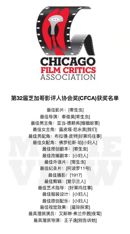 12月15日, 第32届芝加哥影评人协会奖(CFCA)公布获奖影片名单。《寄生虫》被评为最佳影片和最佳外语片,同时斩获最佳原创剧本奖,导演奉俊昊也凭借该作品获得最佳导演奖。格蕾塔·葛伟格导演作品《小妇人》收获最佳女配角、最佳改编剧本、最佳服装设计和最佳原创配乐四项大奖。亚当·德赖弗、露皮塔·尼永奥分获最佳男、女主角奖。