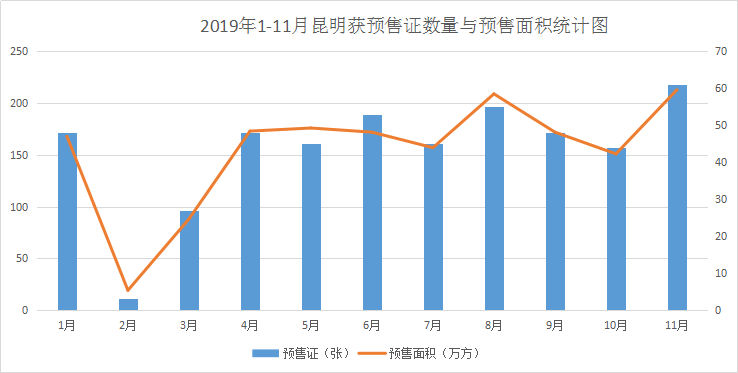 11月,昆明有47项目获得61张预售证,新增预售面积约213万方,创下今年新高。与10月时44张预售证151万方的预售增量相比,11月发放的预售证数量增加了17张,新增预售面积上涨了41%。