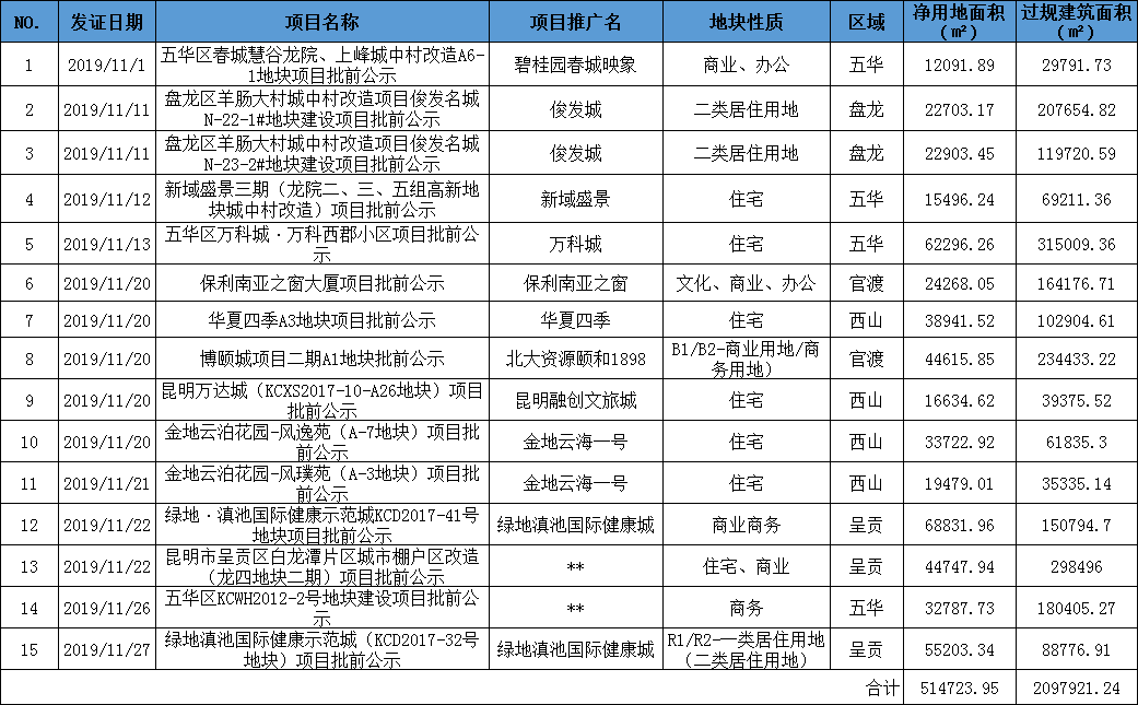 过规审批方面,11月昆明共有12项目通过规划审批,过规总建面约210万方。与10月份288万方的过规增量相比,11月的过规增量下跌了近3成,而与去年同期相比则上涨了12%。