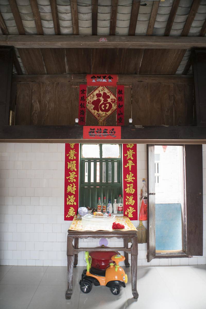 在异乡的人没有忘记家里的香炉和祖屋。赚到钱,拍了照片,总要寄回家。陆续有人回家修缮祖屋,把东南亚的元素也加入其中:印尼的花砖,南洋风格的吊灯,外墙色彩鲜艳的浮雕。只是如今风吹雨淋,已经看不出过去的颜色和形态。即使回不来,也要把照片寄给亲戚,挂在自家墙上。