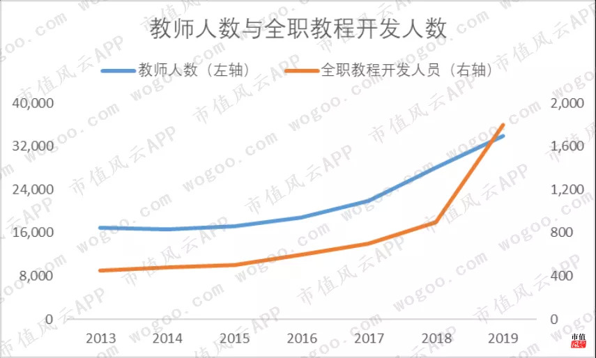 而同期,公司教师人数从2013财年的1.7万人增至2019财年的3.4万人,CAGR 12%。这一增速并不高,如果班级规模没有变大,是不是意味着平均每位教师的课程量提高了?
