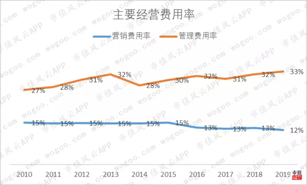 而令风云君一开始不解的是,公司作为行业“一哥”,在所处的行业既拥有规模效应,又经过了长期的运营探索,运营效率提升应该是大概率事件,怎么就不像很多优秀公司一样,画出一道稳步下降的管理费用率曲线呢?相反, 2010-2019财年以上升为主。