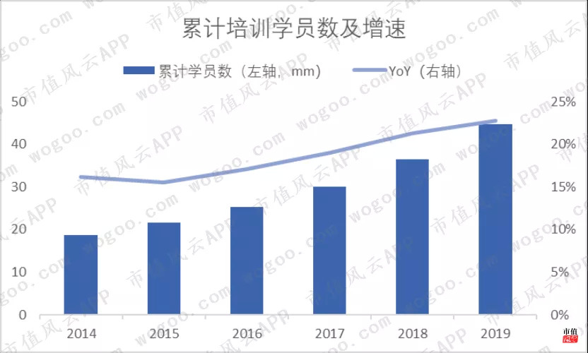 2013-2019财年,参加公司该类型培训的学员人数从73万人增长到352万人,CAGR达到30%,同样取得了显著增长。