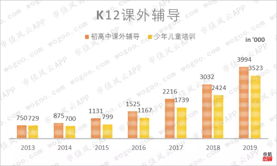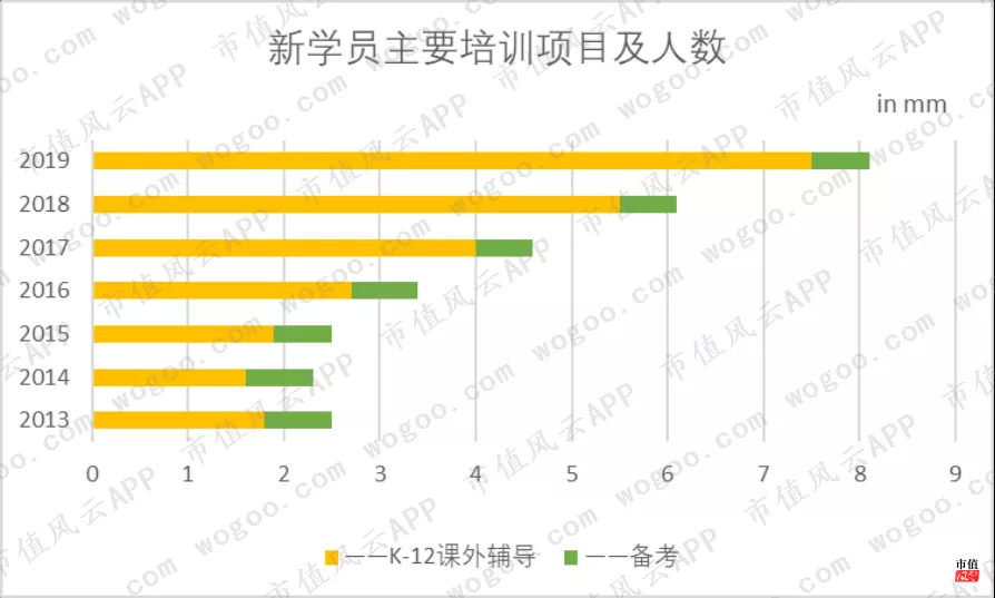 2019财年,公司新入学的840万人当中,K12课外辅导750万人,备考约60万人。显然,K12课外辅导已经是学员中的绝对主力。