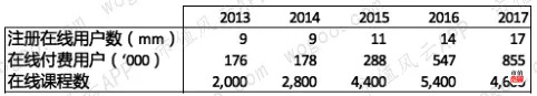 由于新上市公司与过去几年披露口径不一致,导致信息难以纵向对比。仅看截止2017财年的数据,在线付费用户数达到85.5万,自2013年起算的CAGR达到48%。