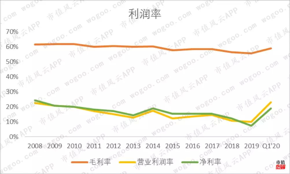公司毛利率总体上稳步小幅下滑,2008财年为 62%,2019财年为56%。