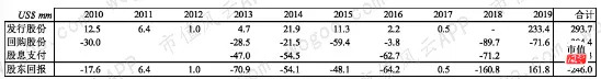 而自由现金流也是呈总体上升态势,2019财年为5.5亿美元,过去10年累计34.4亿美元。看来公司口袋很深,回报股东的能力是杠杠滴,那么实际做的怎么样呢?