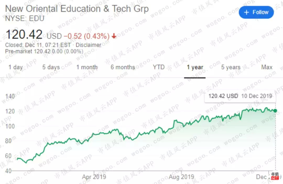 资本市场也丝毫不吝褒奖,过去一年,股价一路从55美元上升到120美元,涨幅120%,市值逼近200亿美元。而它的好buddy好未来(TAL.N)同样表现亮眼,目前市值已经接近270亿美元,二者被市场合称为“中国民办教育双子星”。