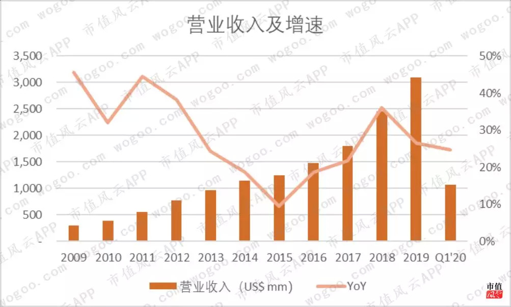 2019财年,公司营收31亿美元,同比增长27%,而自2009年以来的CAGR也是27%。公司站在大体量上依旧保持着高增长。