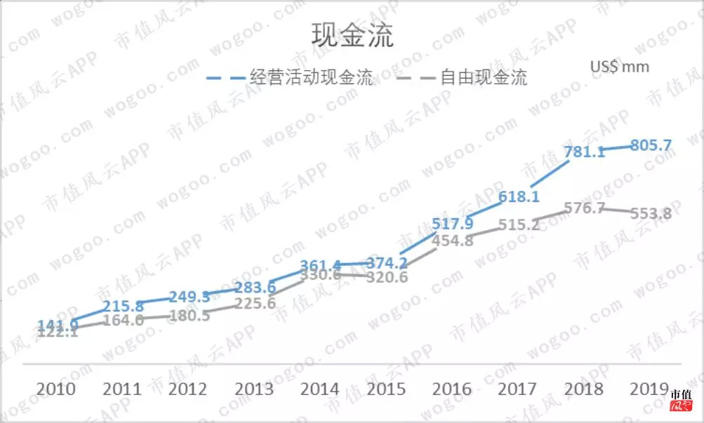 公司历年的经营活动现金流都为正且曲线动人,呈单边上升趋势。2019财年,达到8.1亿美元,而当期的净利润不过2.3亿美元。过去10年,公司通过经营活动赚了43.5亿美元。