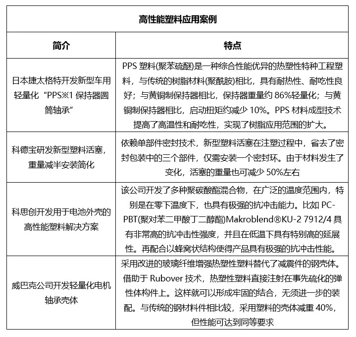 这其中以镁铝合金钢材料的使用最为热门,比如Model S、蔚来ES8等都已经采用了全铝车身。又或者高性能塑料也重点和难点。在过去的几年,一些企业抓住了潮流方向,并展示了自家的高性能塑料应用案例。