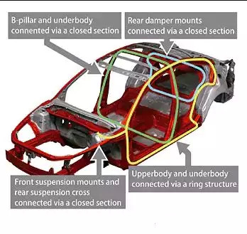 又或者马自达创驰蓝天车身技术。马自达官方给这项技术的评价是:刚度提升30%、重量减轻8%。实现这项技术的精髓在于工程师采用了更加平直的骨架,以及利用了连续框架的概念。可以看到像B柱、侧围、尾箱连接后座的舱口处都呈现了封闭环形结构(框架结构)。