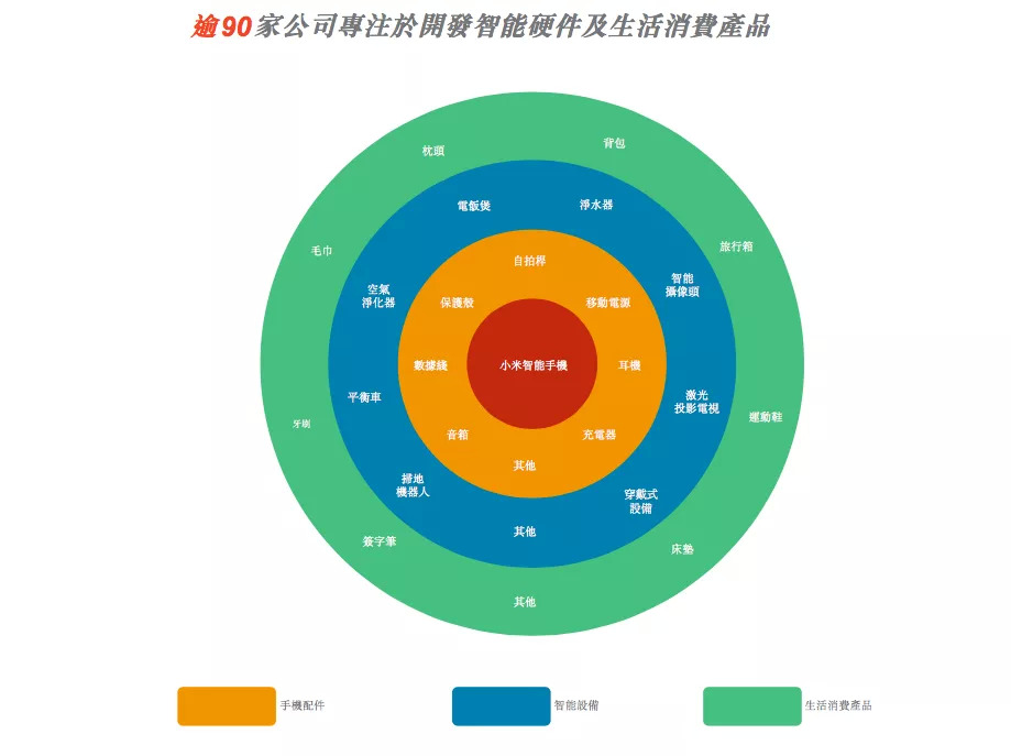 借此,小米形成了以手机为中心,一圈圈向外辐射至手机相关周边、智能硬件、生活耗材等的网状生态链布局。截至目前,小米生态链已经投资了过百个项目,可以说从数量来看,当时的目标已经达成。