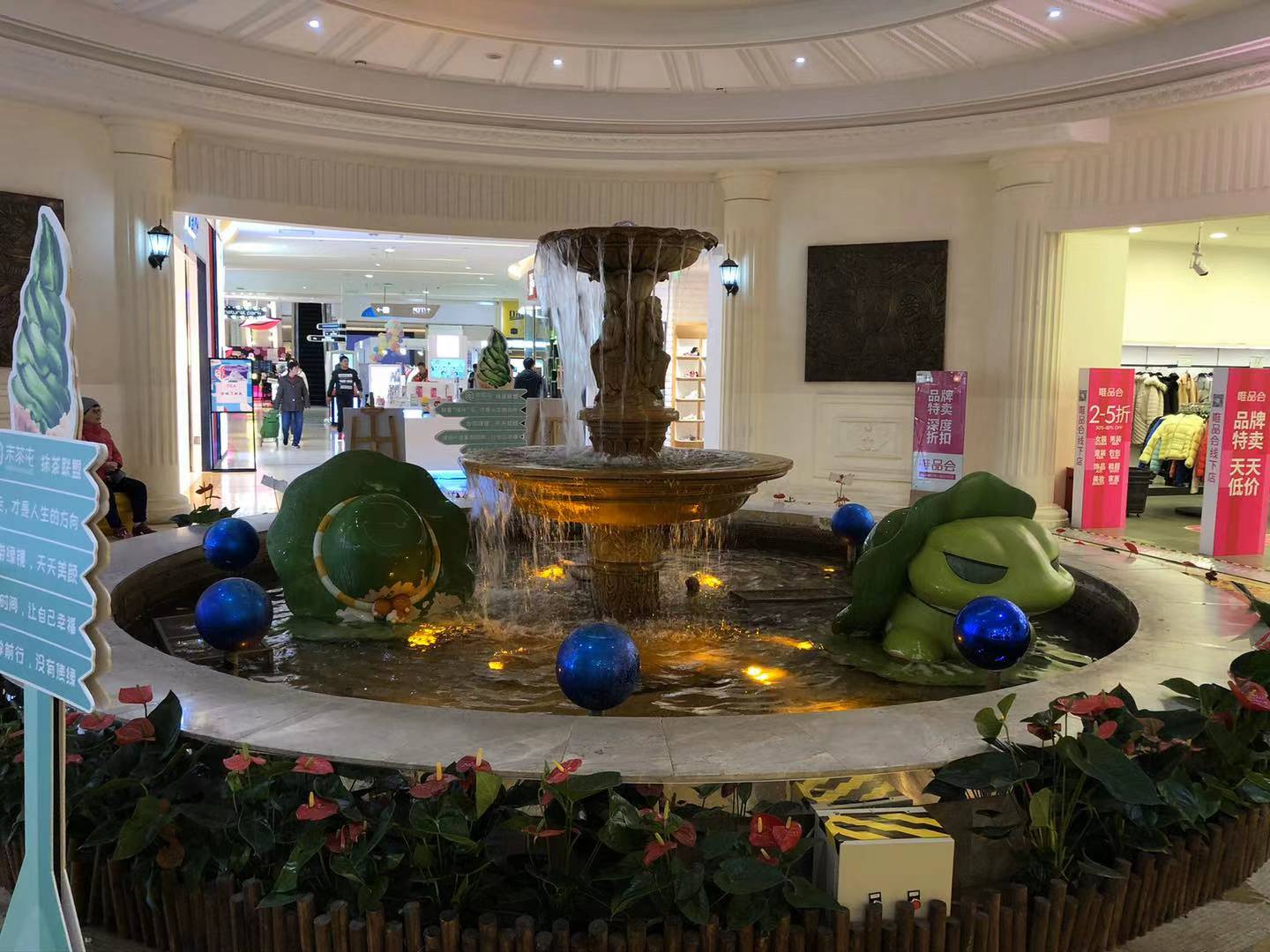 当然,顾客还能从一楼看到当初设计的用心,欧式装潢的喷泉、水池、阶梯等景致之前吸引了很多顾客打卡,但有些也显得不伦不类,比如一楼的喷泉本身营造的是欧式风格,但水池里面又加入了一些当年流行一时的旅行青蛙的雕塑,看起来仿佛是运营者为了追赶热点而作出的调整。