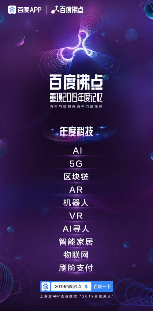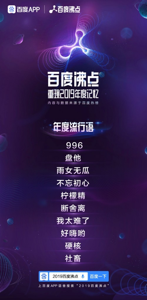 12月16日,百度方面公布了百度沸点2019年度榜单,新中国成立70周年、996、AI、5G等内容成为今年网民热搜热议的对象。作为百度每年年末发布的大数据盘点榜单,今年的百度沸点基于百度热榜对网民搜索及资讯浏览大数据分析,共划分了年度现象、年度作品、年度人物三大类目,发布了包括年度关键词榜、年度国民骄傲榜、年度事件榜、年度泪点榜、年度流行语榜、年度热议榜、年度科技榜、年度沸点人物榜、年度沸点明星榜、年度电影榜、年度电视剧榜、年度综艺榜以及年度小说榜在内的13个榜单,呈现了网民2019年在各个领域中最关注的焦点议题。