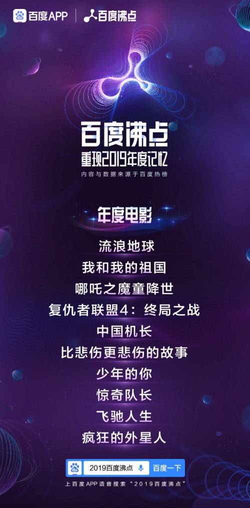 年度电影今年的电影国产剧表现不俗,十大影片中,8部为国产剧,2部为好莱坞大片,且国产剧占据了前三的位置,分别是:《流浪地球》、《我和我的祖国》、《哪吒之魔童降世》。年度电影上榜作品呈现出高票房、高质量的特点,如《哪吒之魔童降世》一举成为内地总票房第二,并被誉为“国漫之光”,口碑与票房双丰收。
