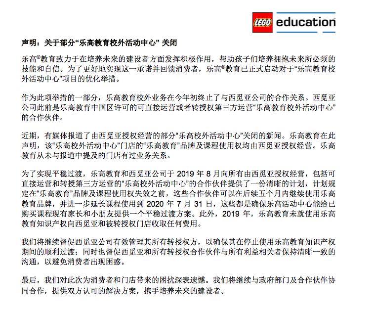 此次关停的三家上海乐高活动中心均直接与西觅亚合作获得品牌授权。但在10月11日,乐高教育曾发布官方声明,终止校外培训业务与西觅亚公司的合作关系。