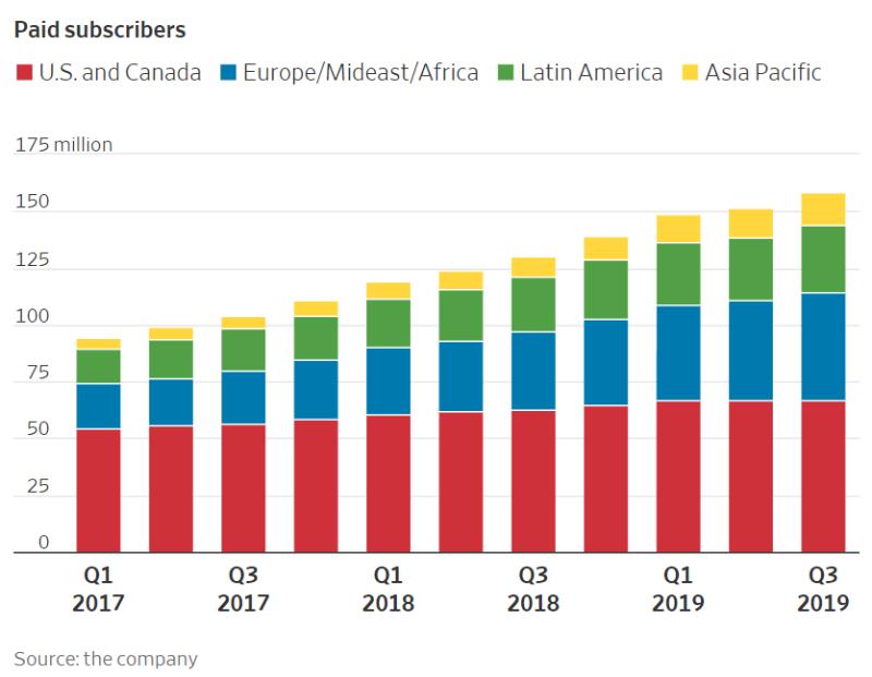 12月17日,据《好莱坞报道》消息,流媒体平台Netflix首次对外公开海外营收情况。数据显示,2019年前三季度,Netflix新增订阅用户总计约1910万,其中约1670万来自北美以外地区,占比达八成以上;亚洲地区占比最少,但增长速度最快,达到53%。目前,Netflix全球范围内拥有1.583亿订阅用户。