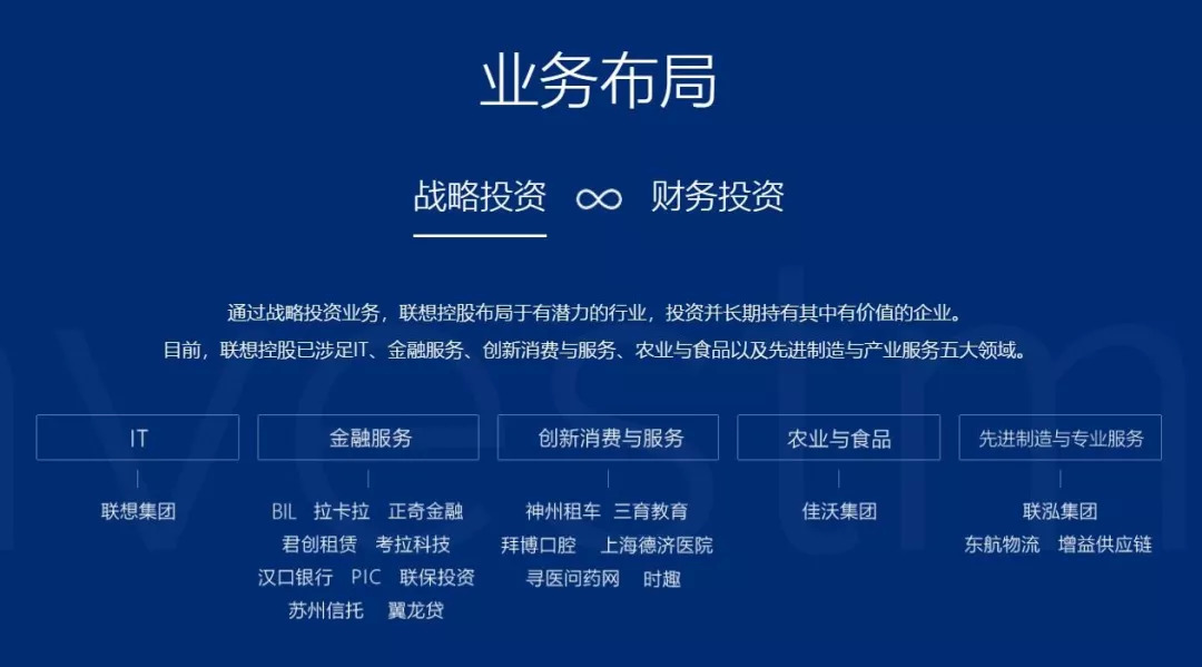 如今,联想控股已经是国内最大的多元化投资集团之一。其战略投资领域除了传统的IT产业,还覆盖金融服务、农业与食品、新材料等板块,财务投资在生命科学、人工智能等高科技领域拥有丰富的布局。