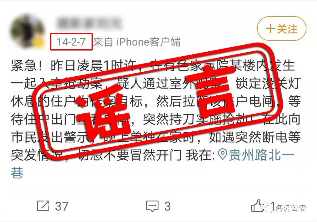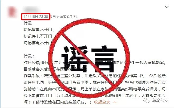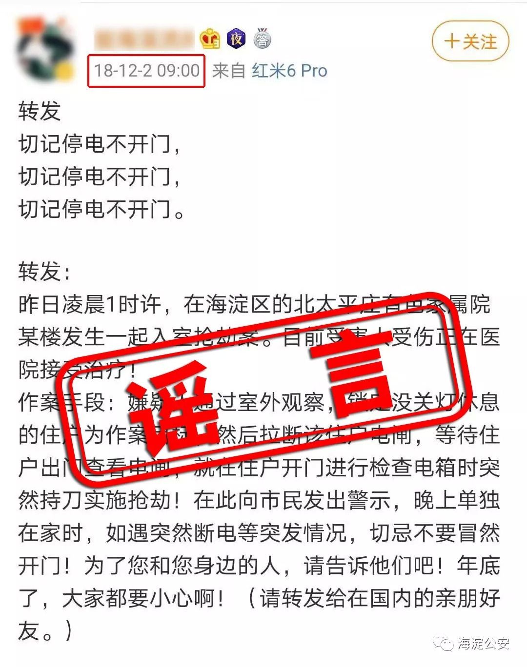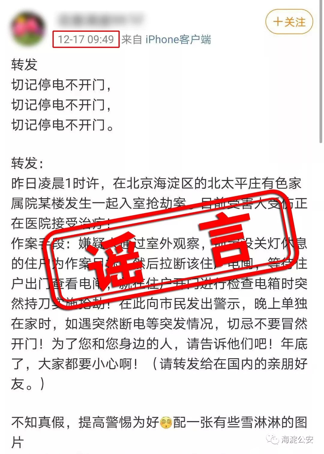 据北京海淀公安分局微信公众号消息,近期,网传海淀区北太平庄有色家属院某楼发生一起入室抢劫案。经海淀公安与110接警平台及辖区北太平庄派出所核实,截至2019年12月17日均无此类警情。如在网络流传信息中出现“海淀区北太平庄有色家属院发生入室抢劫”就是虚假消息。警方再次提醒广大网友们,不传谣、不信谣、不造谣。