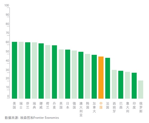 不过,报告也从商业环境、腾飞因素(国家推广新技术和应用的能力)、转化因素(经济体内部对技术变革的态度)以及创新能力四个方面,对全球20个领先经济体进行了分析。结果发现,综合来看中国仅排在第14位。