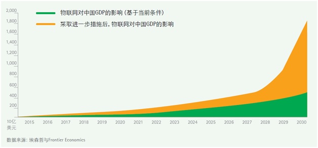 报告称,基于当前政策和投资趋势,到2030年,物联网可为中国创造5000亿美元的累计GDP增长,比目前预测的经济增长速度高出0.3%。其中,制造业、公用事业和资源行业获益最大,占累计GDP总额的60%以上。