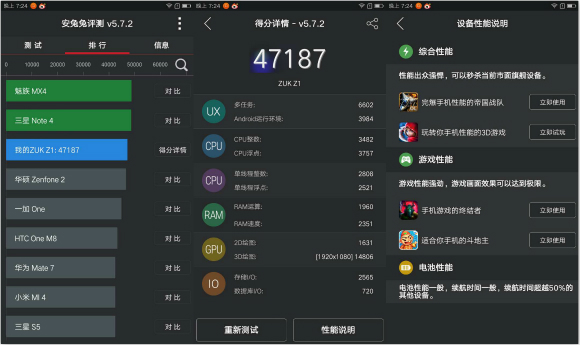 再来看看技术宅最看重的设备配置和性能。ZUK Z1采用了高通骁龙801处理器,搭配3GB RAM+64GB ROM的内存组合,配备4100mAh电池和5.3V 2.5A快速充电器,全面兼容移动/联通/电信的2G/3G/4G网络,支持双卡双待。性能表现请看安兔兔跑分的情况: