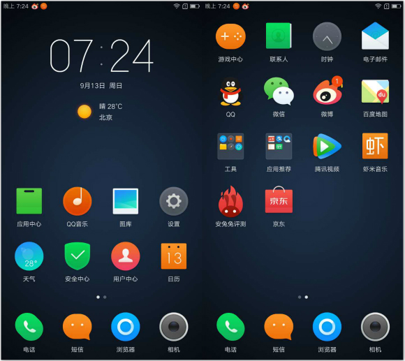 ZUI 据说是基于Android5.1.1开发。桌面UI采用了扁平化的风格,以各种不规则的圆角矩形设计重绘了1500多个应用图标(注意图中京东的图标),设计感强且比较小清新。ZUI目前不支持换主题,也没有内置壁纸商店,但支持每天一张的壁纸推送。